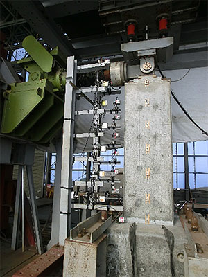 RC橋脚の水平方向の抵抗特性を検討するため、水平交番載荷実験装置によりRC橋脚模型に水平交番載荷を行い、終局耐力を確認しました。