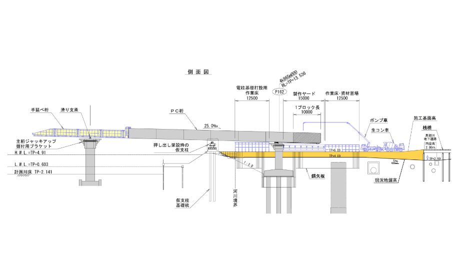押出し工法を用いたPC連続桁の設計を担当した際には、設計における複雑さと向き合う経験となりました。この構造物では、架設の進行に伴って断面力が逐次変化するため、多数の解析ケースを設定し、繰り返し検討を重ねる必要がありました。さらに、架設時と完成時で構造全体の応力度の状態が大きく異なることから、それぞれの条件を満足するPC鋼材の配置に苦心しました。また、架設用の手延べ桁を取り付ける際には、PC鋼材との干渉を避けるための工夫も求められました。